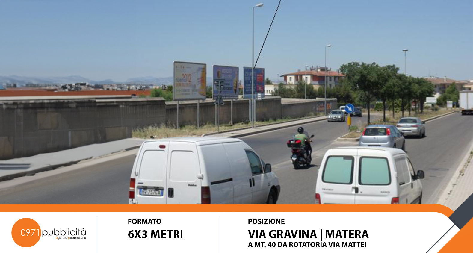Aumenta l’impatto della tua campagna pubblicitaria con manifesti 6×3 metri in posizioni strategiche a Potenza, Matera, e nelle regioni di Puglia, Abruzzo, Campania e Molise. Perfetti per garantire massima visibilità e raggiungere un vasto pubblico, i nostri spazi pubblicitari offrono un’opportunità unica per promuovere il tuo brand o evento in aree ad alto traffico. Investi in un formato pubblicitario che cattura l’attenzione e amplifica la tua presenza nelle principali città del Sud Italia.